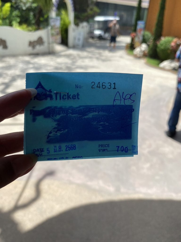 まず、チケットを購入します。約30分の象乗り1回分の料金は大人は700バーツ、身長120cm未満の子供は300バーツです。象には2人で乗ります。1人で乗りたい場合は400バーツのチケットを購入する必要があります。☹ これはちょっと高すぎると思います。