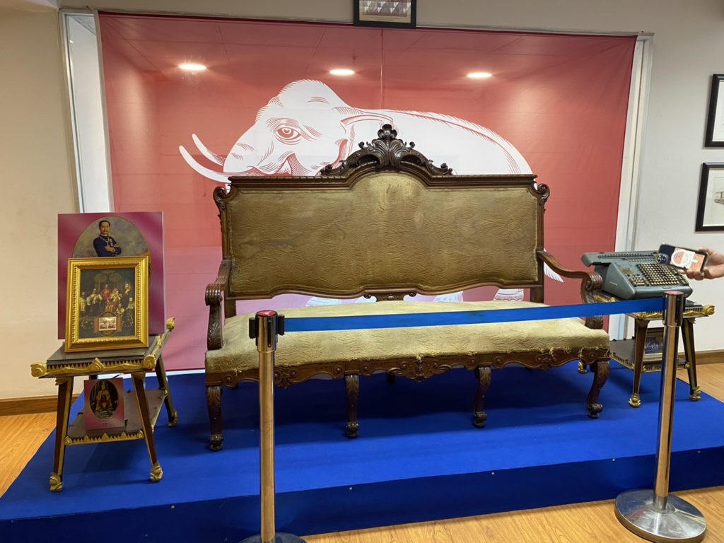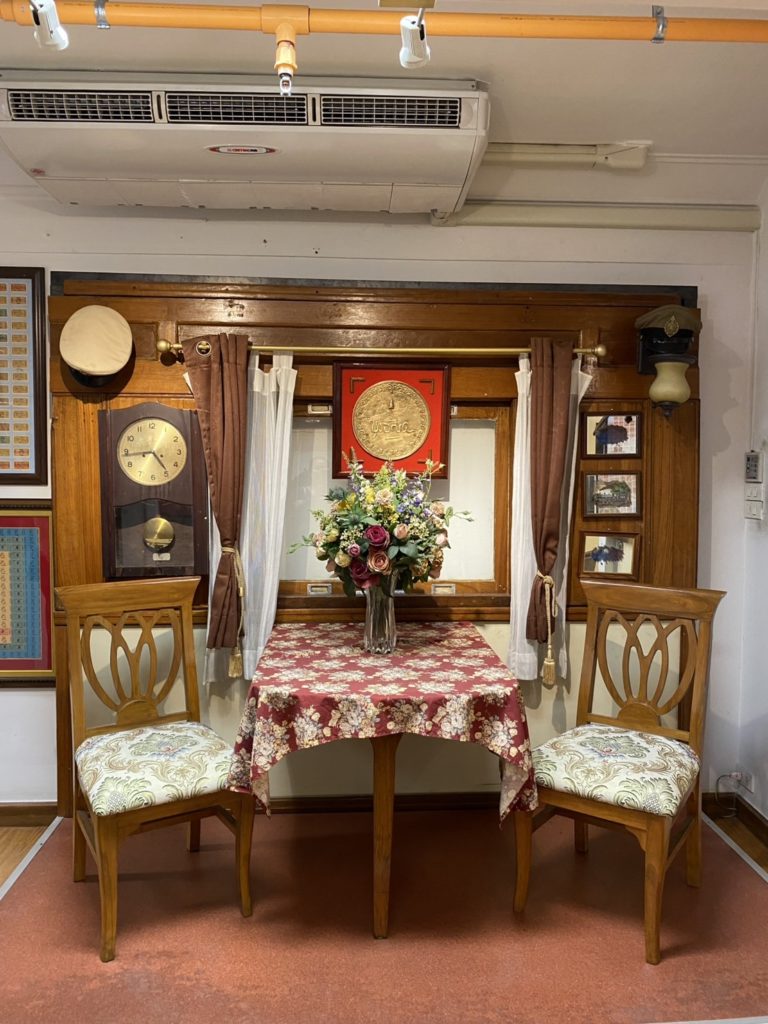 ラーマ7世時代の椅子も展示されています。この椅子は特別列車の車内で使われていた王室用のもので、当時の鉄道や社会に関連する歴史的なアイテムで、タイの王朝時代の文化やデザインを感じることができます。